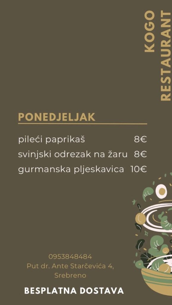 Restoran KOGO, Srebreno, Župa dubrovačka – 095 384 8484, 095 596 8873, moguća dostava