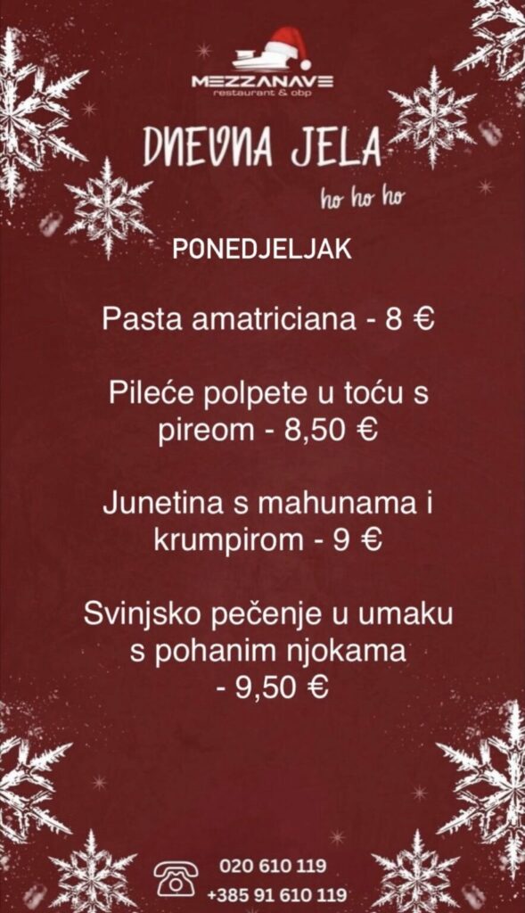 Restoran Mezzanave, Dr. Ante Starčevića 24, telefoni: 020 610 119, 091 610 1119, moguća dostava