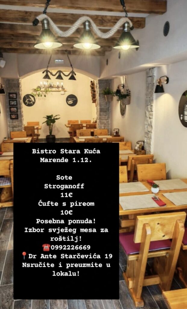 Bistro Strara Kuća, Dr.Ante Starčevića 19, kontakt 099 222 6669, ne vrše dostavu, moguće preuzimanje u restoranu