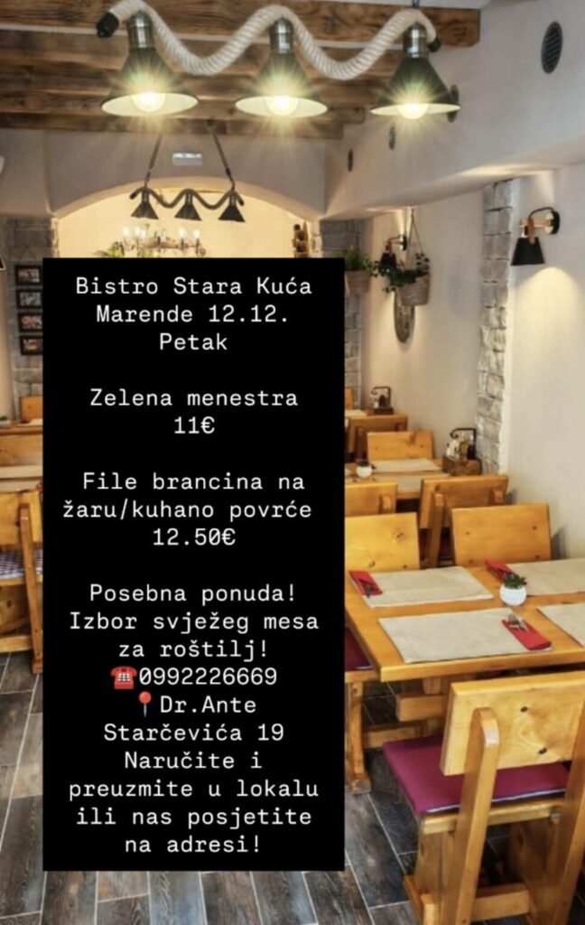Bistro Stara Kuća, Dr.Ante Starčevića 19, kontakt 099 222 6669, ne vrše dostavu, moguće preuzimanje u restoranu