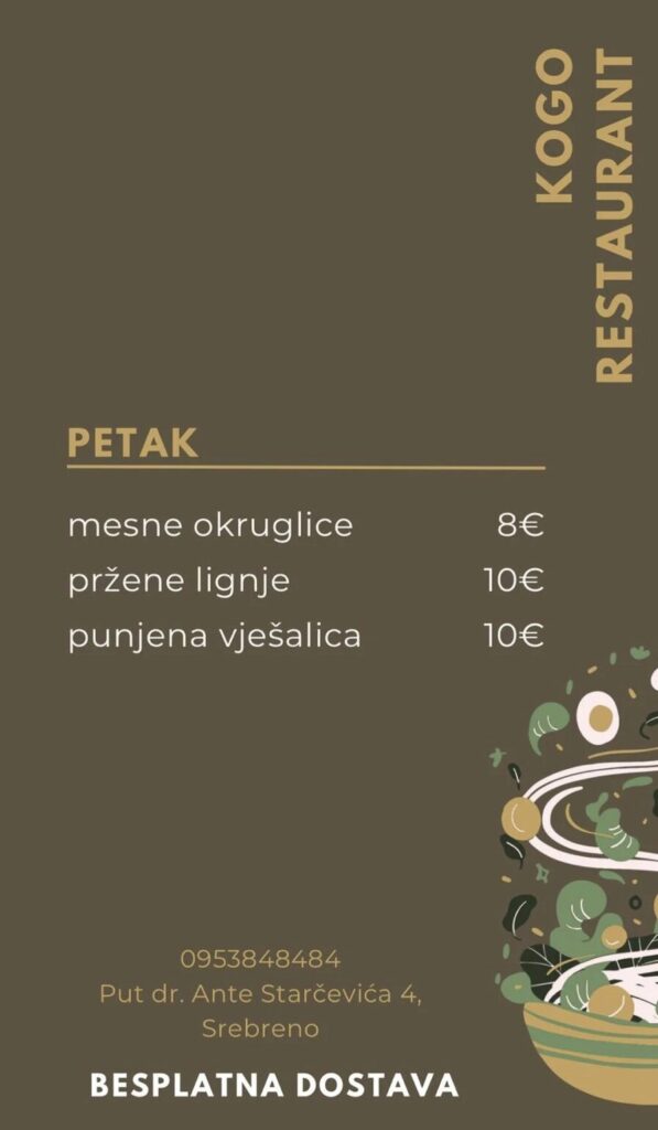 Restoran KOGO, Srebreno, Župa dubrovačka – 095 384 8484, 095 596 8873, moguća dostava