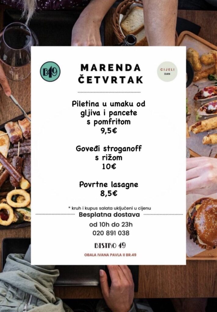Bistro 49, Obala Ivana Pavla II, br.49, kontakt 020 891 038, moguća dostava