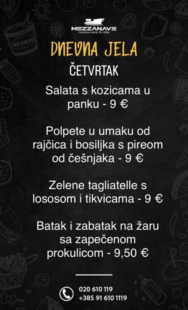 Restoran Mezzanave, Dr. Ante Starčevića 24, telefoni: 020 610 119, 091 610 1119, moguća dostava