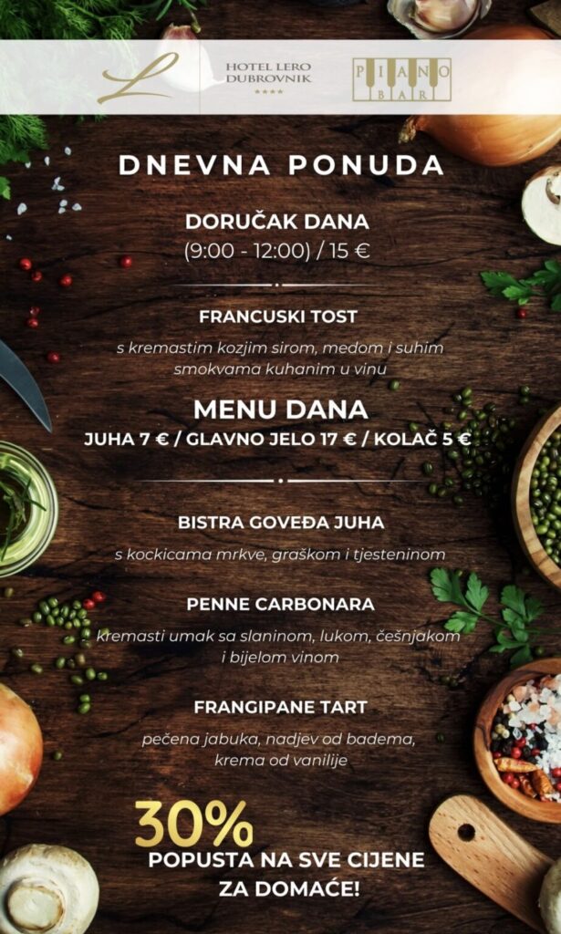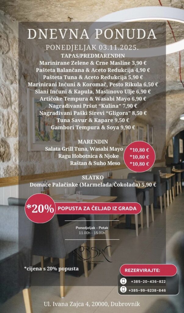 Imate ponudu dnevnih marendi, i želite ih promovirati na dubrovniknetu?! Javite se s povjerenjem na marketing@dubrovniknet.hr ili na 091 344 6000