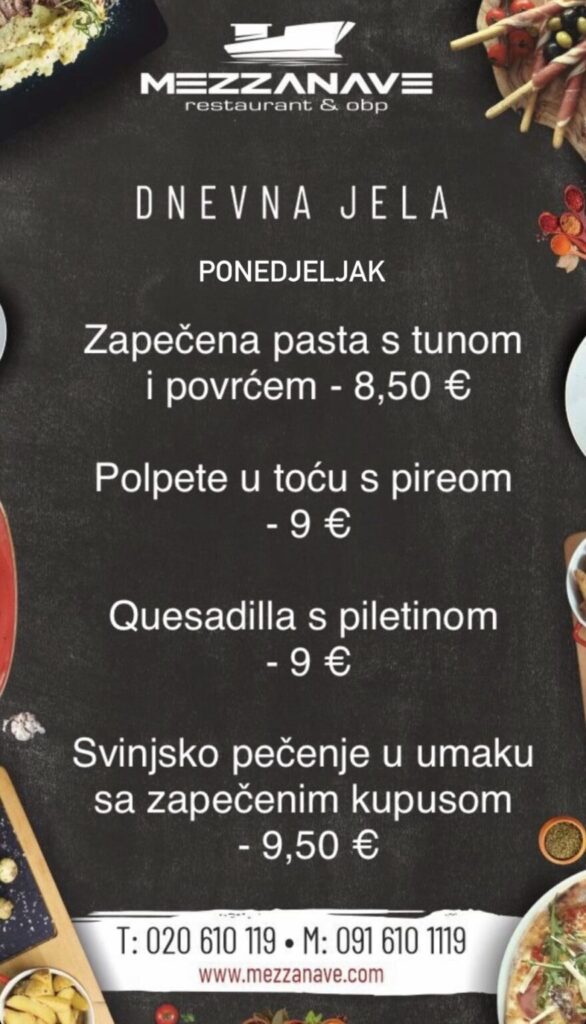 Restoran Mezzanave, Dr. Ante Starčevića 24, telefoni: 020 610 119, 091 610 1119, moguća dostava