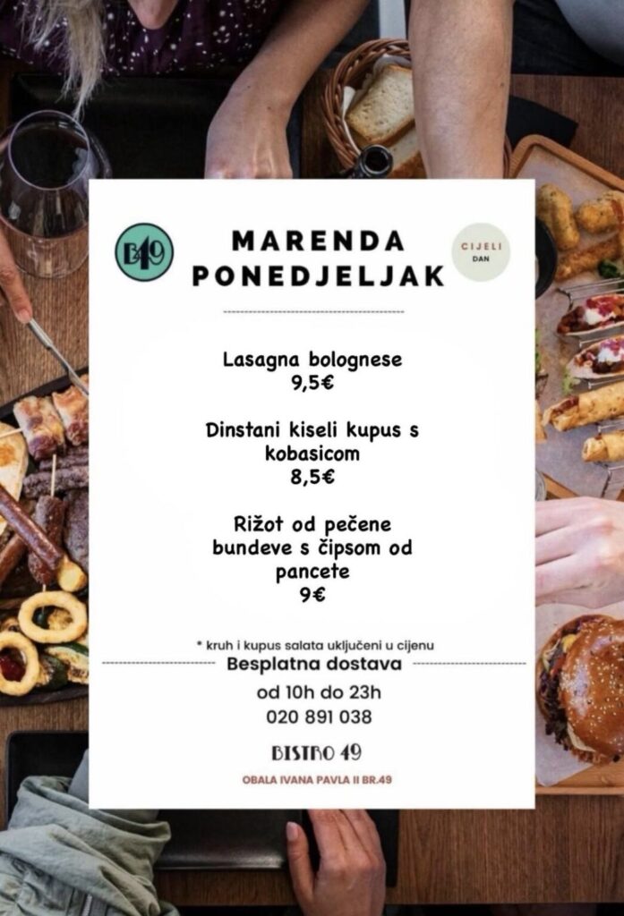 Bistro 49, Obala Ivana Pavla II, br.49, kontakt 020 891 038, moguća dostava