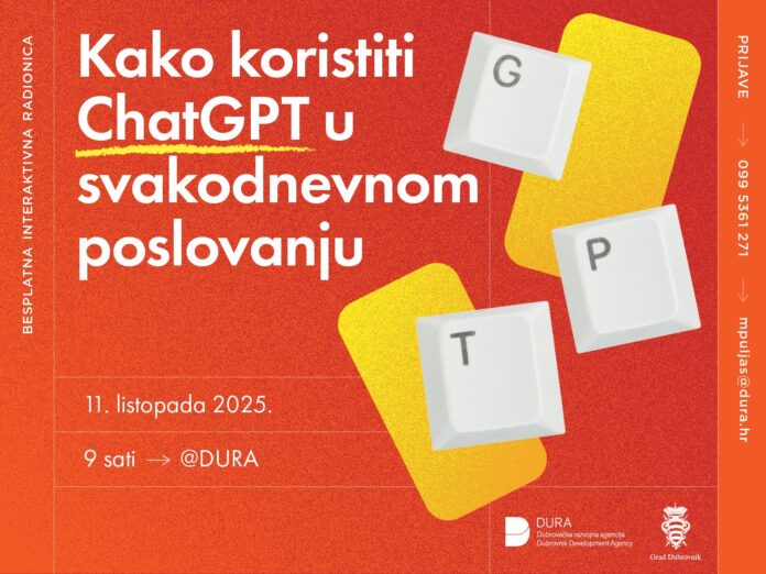 ChatGPT je jedan od najnaprednijih AI alata današnjice, a njegove mogućnosti već mijenjaju način poslovanja diljem svijeta. Ako želite saznati kako vam ovaj alat može pomoći u svakodnevnim zadacima, komunikaciji, donošenju odluka ili razvoju novih ideja – ne propustite radionicu „Kako koristiti ChatGPT u svakodnevnom poslovanju“. Radionica će se održati u okviru Startup akademije u subotu 11. listopada 2025. u prostorijama DURA-e, na adresi Branitelja Dubrovnika 15, 20 000 Dubrovnik, s početkom u 9.00 sati.