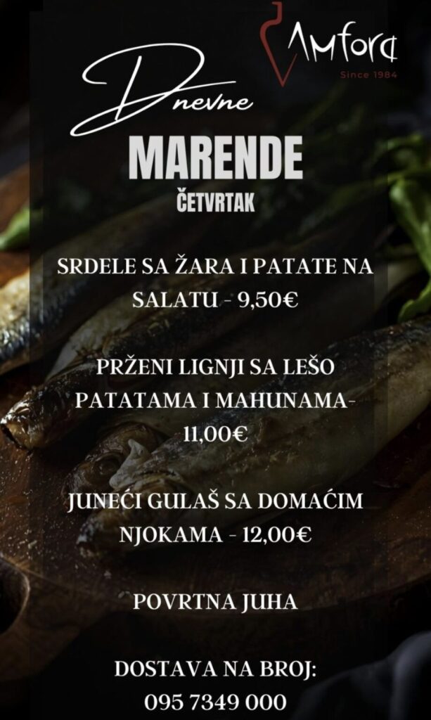 Restoran Amfora, Obala Stjepana Radića 26, Gruž, kont. 098 933 6158, ne vrše dostavu, moguće preuzimanje u restoranu
