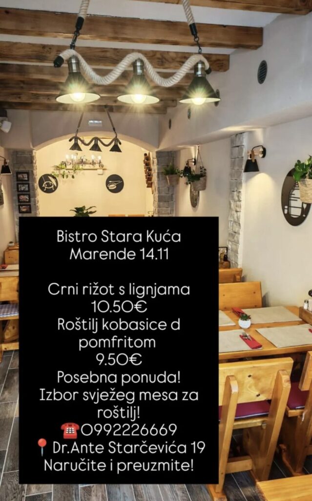 Bistro Strara Kuća, Dr.Ante Starčevića 19, kontakt 099 222 6669, ne vrše dostavu, moguće preuzimanje u restoranu