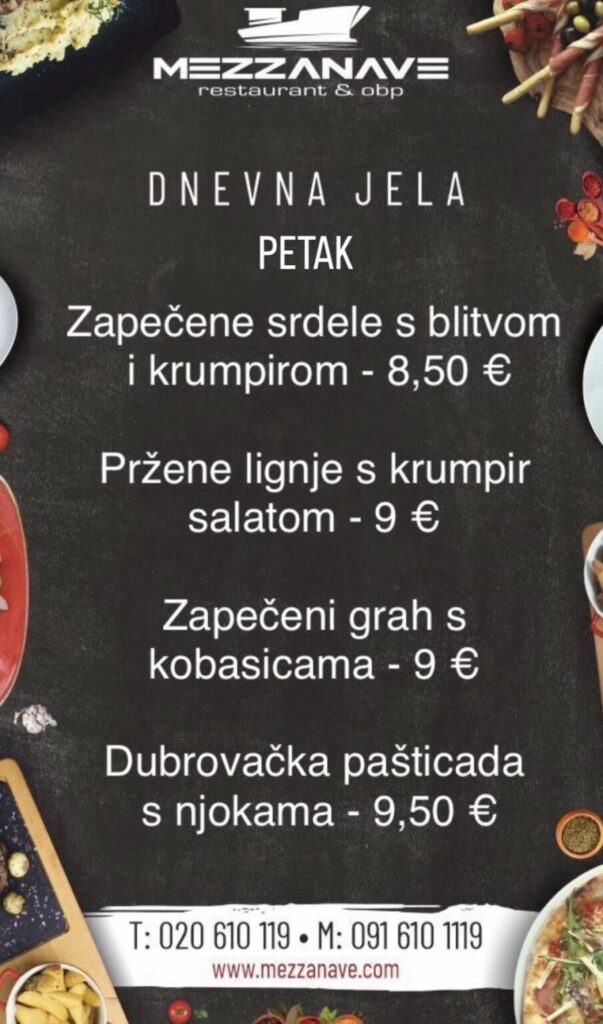 Restoran Mezzanave, Dr. Ante Starčevića 24, telefoni: 020 610 119, 091 610 1119, moguća dostava
