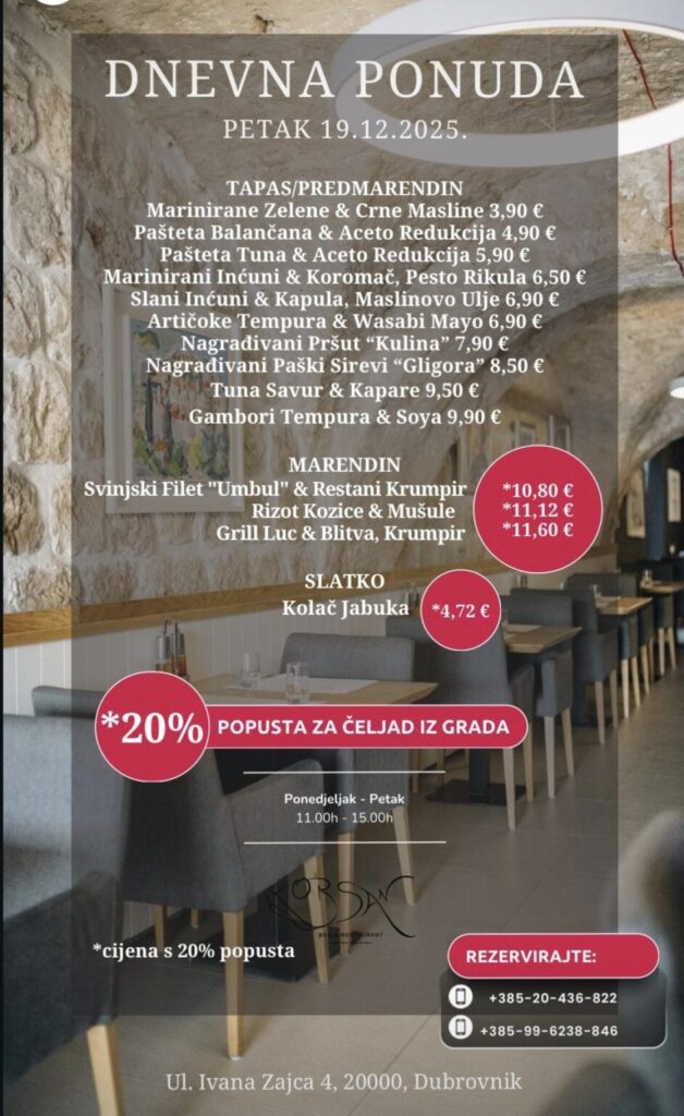 Imate ponudu dnevnih marendi, i želite ih promovirati na dubrovniknetu?! Javite se s povjerenjem na marketing@dubrovniknet.hr ili na 091 344 6000