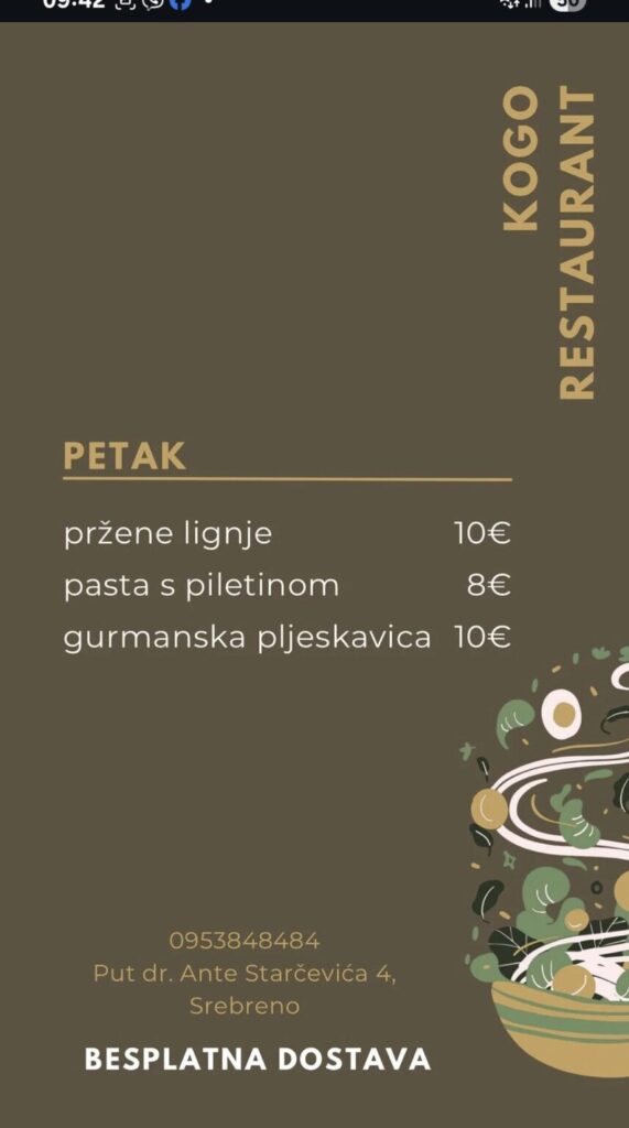 Restoran KOGO, Srebreno, Župa dubrovačka – 095 384 8484, 095 596 8873, moguća dostava