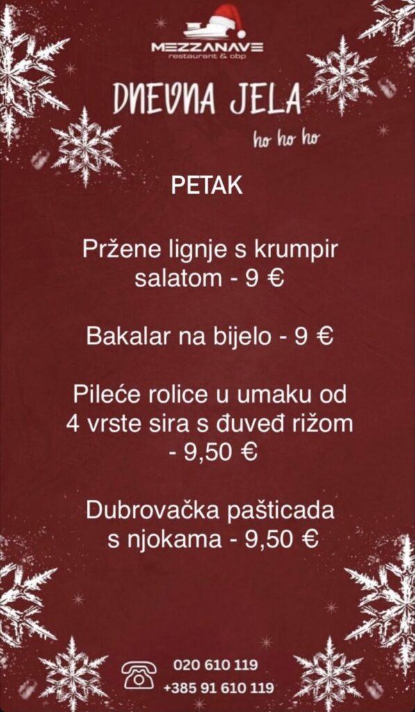 Restoran Mezzanave, Dr. Ante Starčevića 24, telefoni: 020 610 119, 091 610 1119, moguća dostava