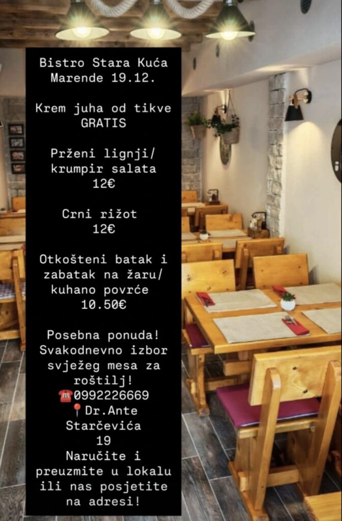 Bistro Stara Kuća, Dr.Ante Starčevića 19, kontakt 099 222 6669, ne vrše dostavu, moguće preuzimanje u restoranu