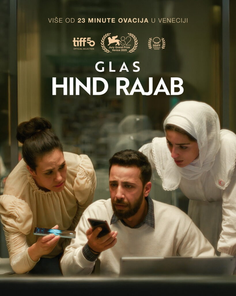 Višestruko nagrađivan film “Glas Hind Rajab”, redateljice, dvaput nominirane za Oscara, Kaouther Ben Hanie. Film je svjetsku premijeru imao u natjecateljskom programu festivala u Veneciji, gdje je dobio Veliku nagradu žirija i dosad najduže zabilježene ovacije na nekom filmskom festivalu, od preko 23 minute! Prikazan je i nagrađen na brojnim drugim svjetskim festivalima te je tuniski kandidat za Oscara za najbolji međunarodni igrani film. Riječ je o događaju koji se zbio 29. siječnja 2024. Kad su volonteri Crvenog polumjeseca zaprimili hitan poziv: šestogodišnja djevojčica zarobljena je u automobilu pod paljbom u Gazi i moli za spašavanje. Dok je pokušavaju zadržati na liniji, čine sve što mogu kako bi joj poslali kola hitne pomoći. Djevojčica se zvala Hind Rajab.