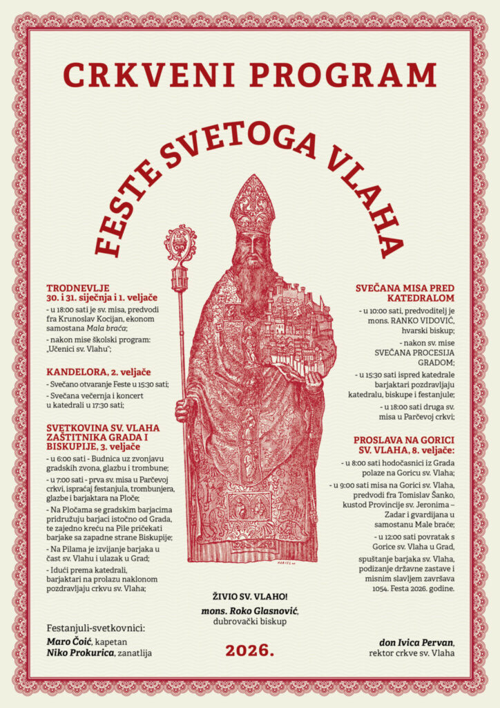 Po milosti Božjoj i pod zaštitom našega parca, nebeskog zaštitnika, sv. Vlaha, mučenika i biskupa, najavljujemo njegovu Festu, Anno Domini 2026., koja ove godine slavi po 1054. put od kada je naš Grad, zahvalan svom nebeskom branitelju, započeo ovo sveto slavlje zajedništva, vjere i slobode.