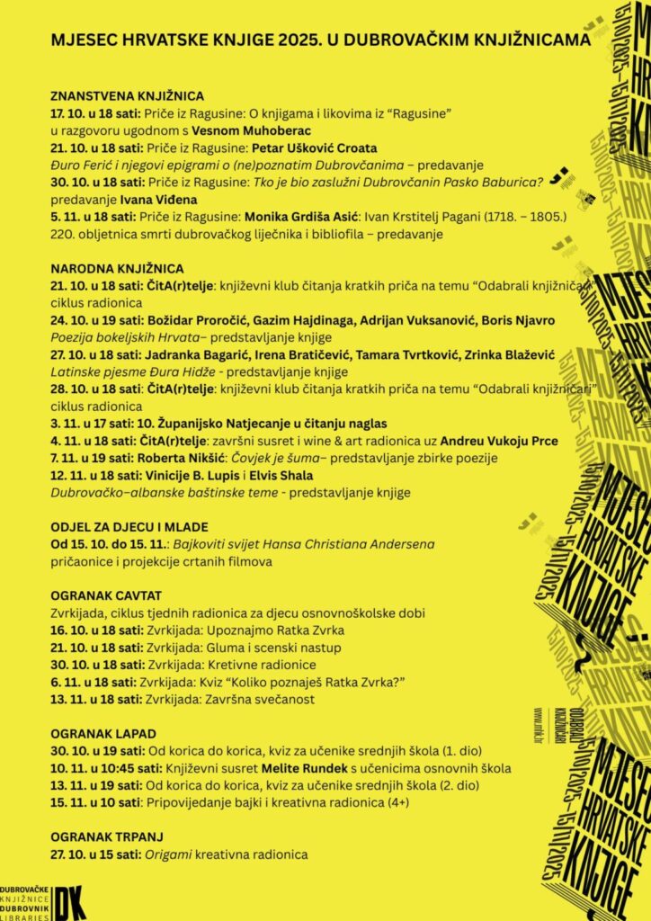Narodna knjižnica Grad (Ulica od puča 6)svoj program Mjeseca hrvatske knjige počinje ciklusom radionica ČitA(r)telje (21.10., 28.10. i 4.11. u 18 sati), odnosno književnim klubom čitanja kratkih priča na temu Odabrali knjižničari (zbog ograničenog broja mjesta prijave se primaju na e-mail informacijska.sluzba@dkd.hr).Božidar Proročić, Gazim Hajdinaga, Adrijan Vuksanović i Boris Njavro, 24. 10. u 19 sati, predstavit će knjiguPoeziju bokeljskih Hrvata. Jadranka Bagarić, Irena Bratičević, Tamara Tvrtković i Zrinka Blažević predstavit ćeLatinske pjesme Đura Hidže 27. 10. u 18 sati. Deseto Županijsko Natjecanje u čitanju naglas održat će se 3. 11. u 17 sati. Predstavljanje zbirke poezije Čovjek je šuma Roberte Nikšić bit će 7. 11. u 19 sati, a 12. 11. u 18 sati, Vinicije Lupis i Elvis Shala predstavit će knjigu Dubrovačko–albanske baštinske teme.