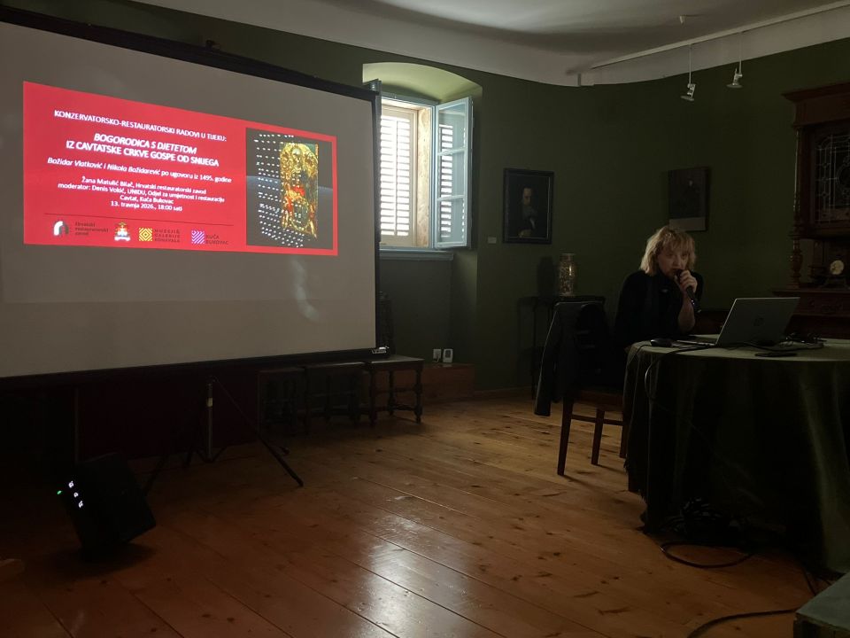 Predavanje “Konzervatorsko-restauratorski radovi u tijeku: Bogorodica s Djetetom iz cavtatske crkve Gospe od Snijega. Božidar Vlatković i Nikola Božidarević po ugovoru iz 1495. godine”, održano je u ponedjeljak 13. travnja u Kući Bukovac u Cavtatu. Predavačica je bila izv. prof. dr. sc. Žana Matulić Bilač iz Hrvatskog restauratorskog zavoda, a moderator događaja prof. dr. sc. Denis Vokić s Odjela za umjetnost i restauraciju UNIDU-a.