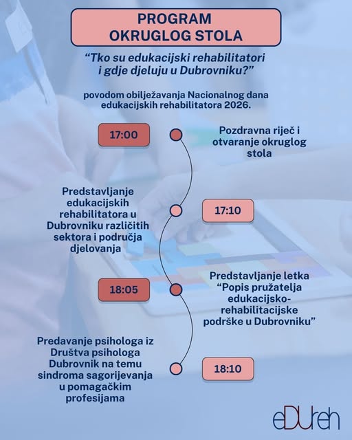 Povodom obilježavanja Nacionalnog dana edukacijskih rehabilitatora, Udruga edukacijskih rehabilitatora Dubrovačko-neretvanske županije “eDUreh” organizira okrugli stol na temu Tko su edukacijski rehabilitatori i gdje djeluju u Dubrovniku?