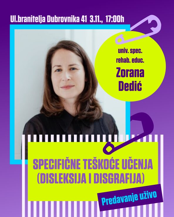 Prvo predavanje „Specifične teškoće učenja (disleksija i disgrafija)“ donosi uvid u to kako ove teškoće utječu na čitanje, pisanje i praćenje nastave, zašto su ispiti i pisani radovi poseban izazov te koliko digitalni alati i pristupačni materijali mogu pomoći studentima u učenju. Naglasak je na razumijevanju, prilagodbi i podršci profesora i kolega, jer su upravo oni ključni za stvaranje ravnopravnijeg studijskog okruženja. Predavanje vodi Zorana Dedić, magistra logopedije i sveučilišna specijalistica rane intervencije, s bogatim iskustvom u radu s djecom i mladima te u edukaciji stručnjaka i roditelja. Održat će se u ponedjeljak, 3. studenog 2025. u 17 sati.