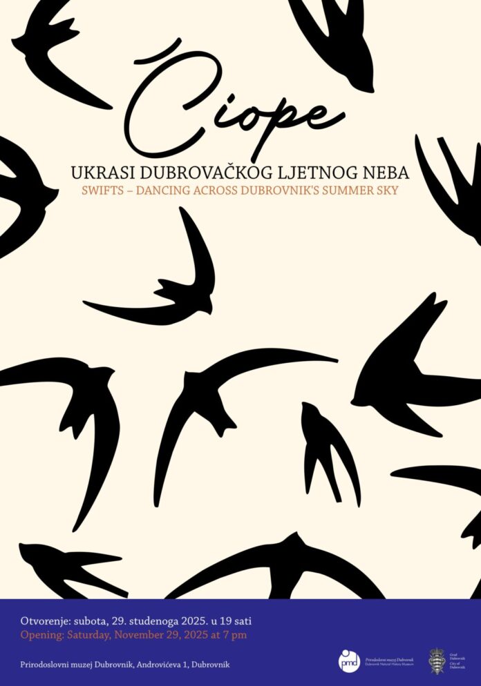 U subotu, 29. studenoga 2025. godine u Prirodoslovnom muzeju Dubrovnik u 19 sati upriličit će se svečano otvorenje izložbe Čiope – ukrasi dubrovačkog ljetnog neba. Autorice izložbe su Ana Čučević, viša kustosica i ravnateljica Prirodoslovnog muzeja Dubrovnik te Dubravka Tullio, viša kustosica pedagoginja. Autori likovnog postava izložbe su Ana Čučević, Šime Fabris i Dubravka Tullio.