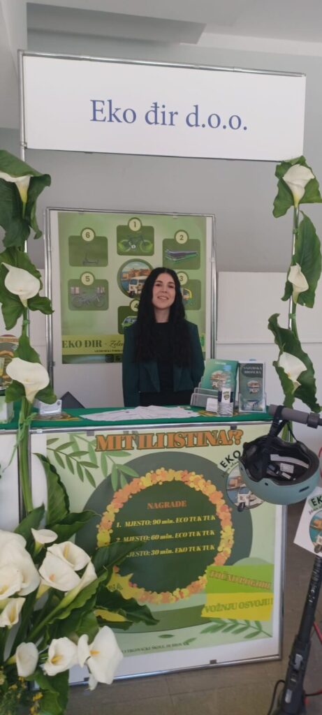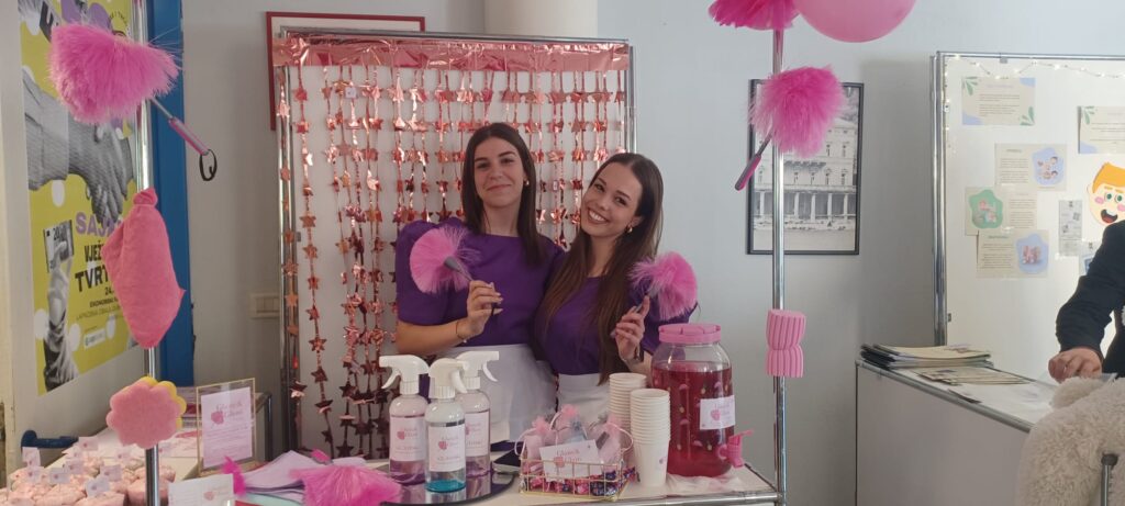 – Eko đir bavi se ekološkim prijevozom tuk-tuk vozilima i tvrtka promiče kulturu ekološkog prijevoza koja stavlja okoliš, zajednicu i zdravlje na prvo mjesto – objasnila nam je zaposlenica Eko đira Lejla Osmani: – Imamo i nagradnu igru ‘Istina ili mit’ u kojoj pobjednik osvaja 90 minuta vožnje tuk-tukom za četiri osobe, drugi 60 a treći 35 minuta vožnje – kaže Lejla koja objašnjava kako voditi firmu nije teško kad je u ekipi desetoro kolega iz trećeg razreda ekonomskih komercijalista. Sviđaju joj se sve ideje koje je predstavila konkurencija i na sajmu i na društvenim mrežama. Njeni su favoriti uz Eko đir, na sajmu cure iz tvrtke Glanc&Glam iz Ekonomske škole, tvrtka koja se bavi luksuznim čišćenjem pod sloganom „Gdje je sjaj tu je raj“. Lucija Mitić i Marta Vezilić, čistačice su ove tvrtke koja je zbog njih dvije i njihovih glamuroznih uniformi i ružičastih peruški za prašinu izazvala najviše pozornosti mada ih je ukupno dvanaest u tvrtki. Dora Vuletić, voditeljica štanda kaže nam kako su njihovi klijenti veće kupovne moći kako bi im se odradila što bolja usluga:
