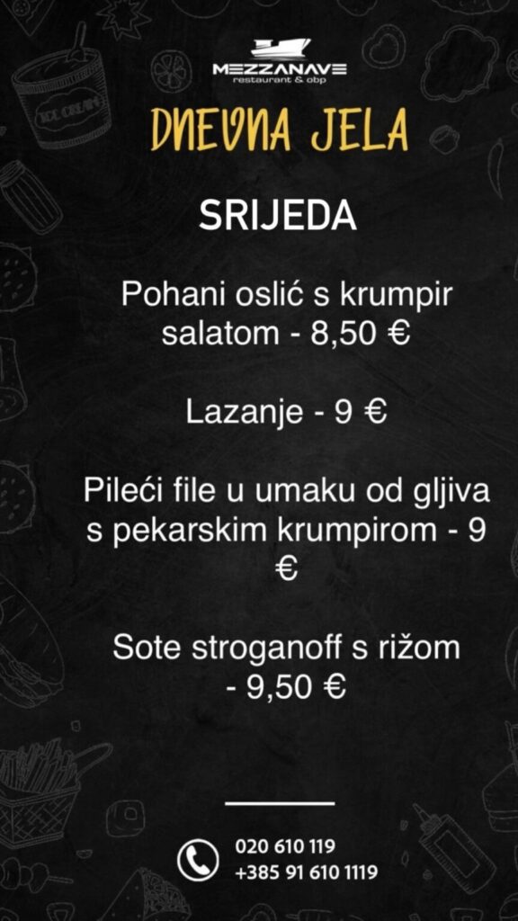 Restoran Mezzanave, Dr. Ante Starčevića 24, telefoni: 020 610 119, 091 610 1119, moguća dostava