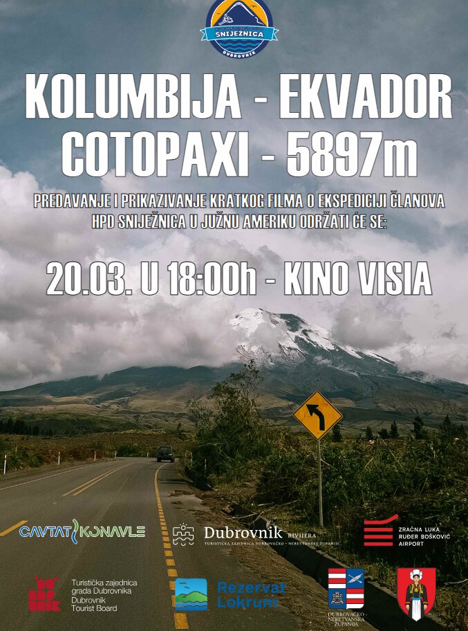 Članovi HPD Sniježnica predstavit će ekspediciju u Kolumbiju i Ekvador, tijekom koje su se popeli na vulkan Cotopaxi (5897 m), a u sklopu predavanje bit će prikazane fotografije i kratki film.