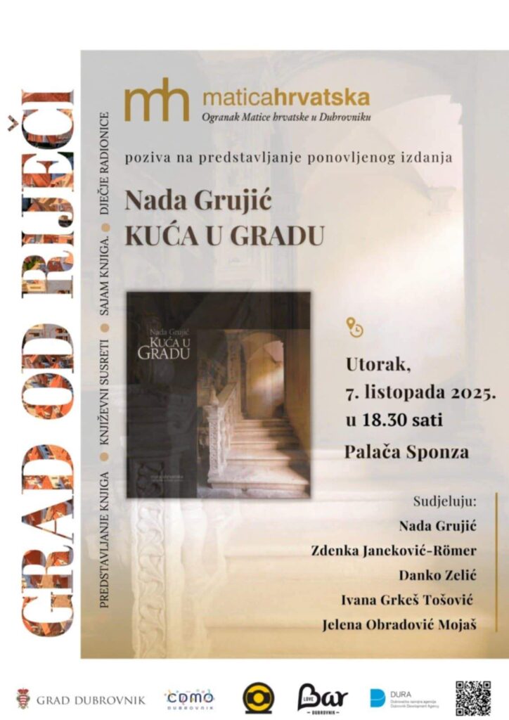 Ponovljeno izdanje jedne od “kultnih” dubrovačkih knjiga, “Kuća u Gradu” Nade Grujić, bit će predstavljeno u Sponzi 7. listopada, u 18:30 sati.