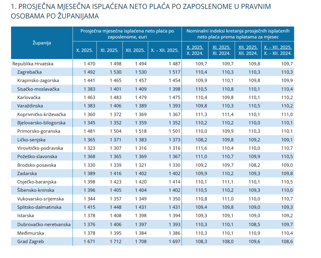 Prosječna mjesečna isplaćena neto plaća po zaposlenome u pravnim osobama u četvrtom tromjesečju 2025. u odnosu na isto razdoblje 2024. porasla je u svim županijama. Najviše je porasla u Koprivničko-križevačkoj županiji, za 11,0%, a najmanje u Gradu Zagrebu, za 8,6%, objavio je Državni zavod za statistiku.