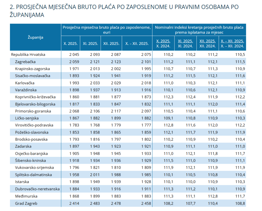 Najviša prosječna mjesečna bruto plaća po zaposlenome u pravnim osobama u četvrtom tromjesečju 2025. bila je u Gradu Zagrebu, u iznosu od 2 458 eura, a najmanja u Virovitičko-podravskoj županiji, u iznosu od 1 777 eura.