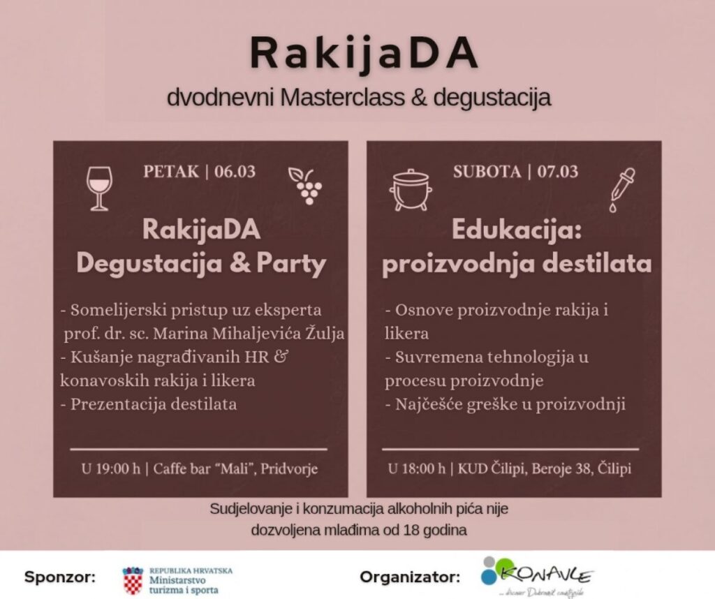 Udruga Agroturizam Konavle s ponosom najavljuje novi projekt „RakijaDA“, dvodnevni događaj posvećen popularizaciji, edukaciji i podizanju kvalitete autohtonih jakih alkoholnih pića. Program, koji će se održati ovog petka i subote, 6. i 7. ožujka, namijenjen je lokalnim proizvođačima, ugostiteljima, ali i svim konzumentima i ljubiteljima rakija i likera.