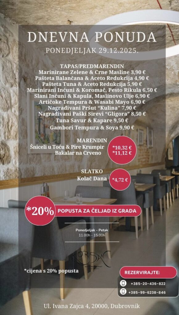 Imate ponudu dnevnih marendi, i želite ih promovirati na dubrovniknetu?! Javite se s povjerenjem na marketing@dubrovniknet.hr ili na 091 344 6000