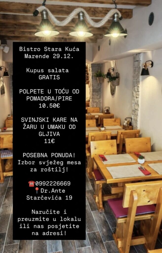 Bistro Stara Kuća, Dr.Ante Starčevića 19, kontakt 099 222 6669, ne vrše dostavu, moguće preuzimanje u restoranu