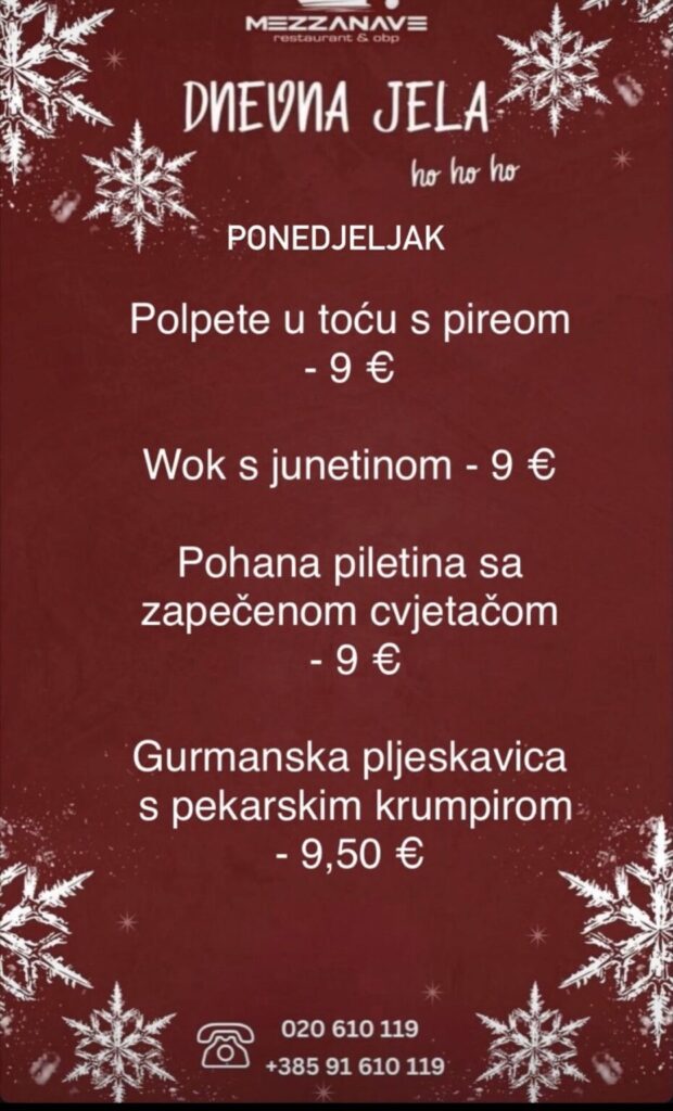 Restoran Mezzanave, Dr. Ante Starčevića 24, telefoni: 020 610 119, 091 610 1119, moguća dostava
