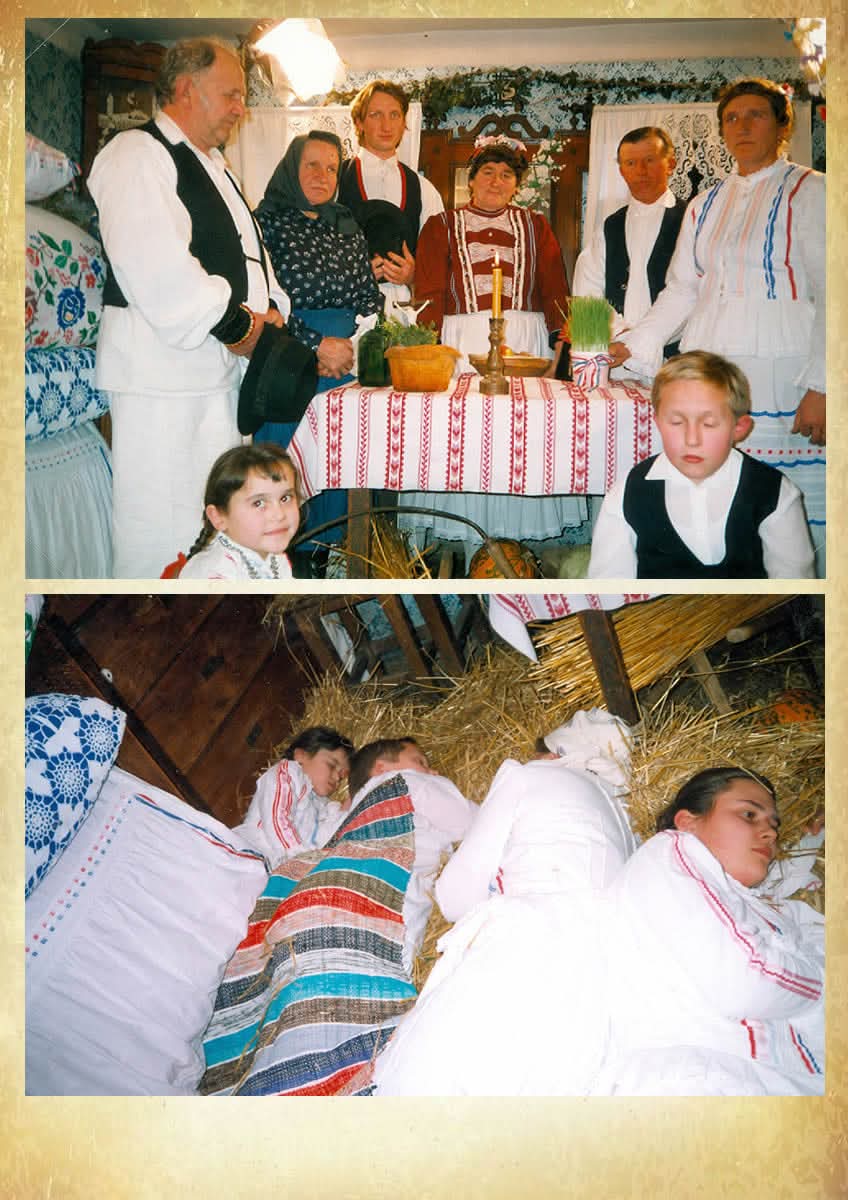 - Unošenje slame – nagovor, molitva; vezanje užetom nožica stola i postavljanje božićnog stola