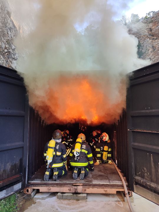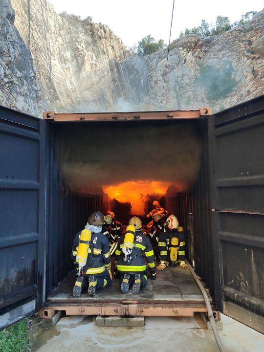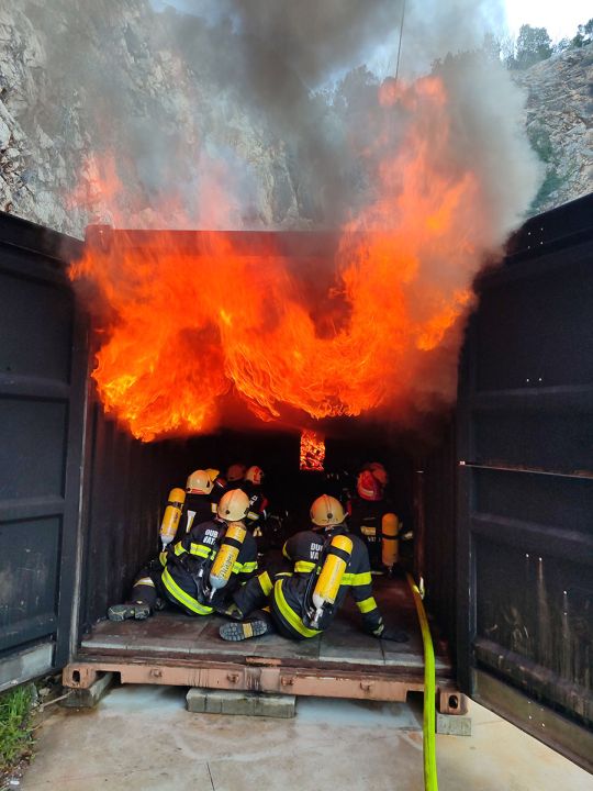 Praktični rad u simulatoru: Četiri ulaska u „vrući“ simulator s drvenim paletama gdje su vatrogasci u kontroliranim uvjetima osjetili toplinu i vježbali tehnike hlađenja gorivih plinova-dima.