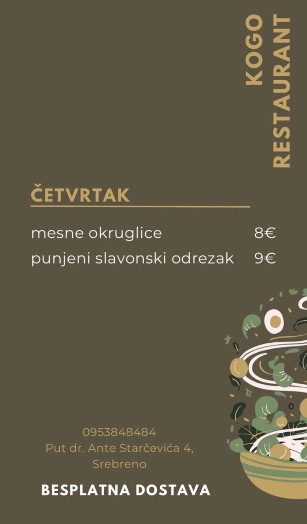 Restoran KOGO, Srebreno, Župa dubrovačka – 095 384 8484, 095 596 8873, moguća dostava