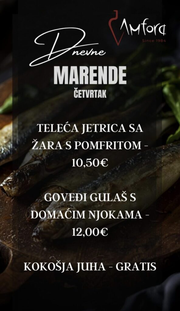 Restoran Amfora, Obala Stjepana Radića 26, Gruž, kont. 098 933 6158, ne vrše dostavu, moguće preuzimanje u restoranu