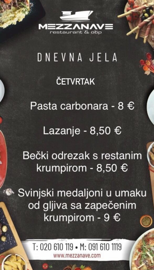Restoran Mezzanave, Dr. Ante Starčevića 24, telefoni: 020 610 119, 091 610 1119, moguća dostava