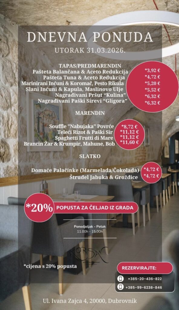 Imate ponudu dnevnih marendi, i želite ih promovirati na dubrovniknetu?! Javite se s povjerenjem na marketing@dubrovniknet.hr ili na 091 344 6000