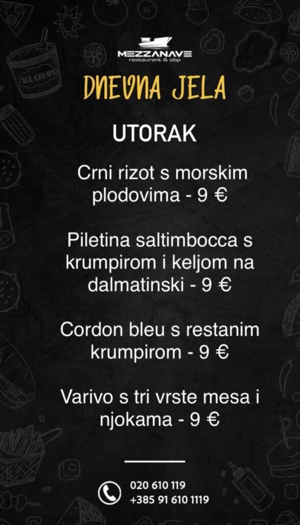 Restoran Mezzanave, Dr. Ante Starčevića 24, telefoni: 020 610 119, 091 610 1119, moguća dostava