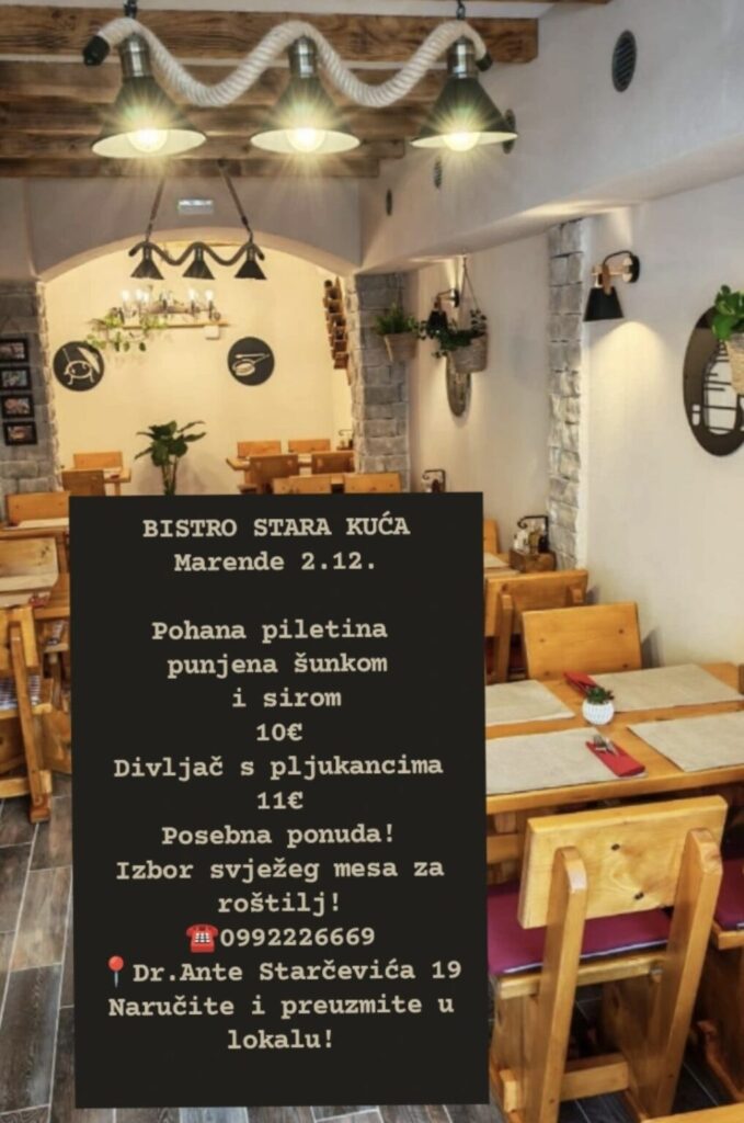 Bistro Strara Kuća, Dr.Ante Starčevića 19, kontakt 099 222 6669, ne vrše dostavu, moguće preuzimanje u restoranu