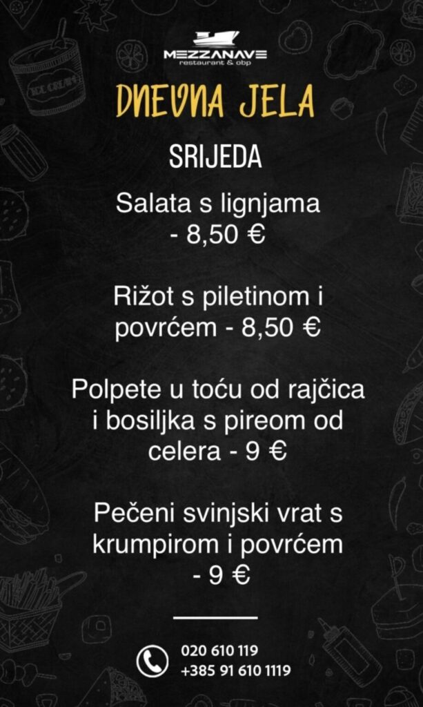 Restoran Mezzanave, Dr. Ante Starčevića 24, telefoni: 020 610 119, 091 610 1119, moguća dostava
