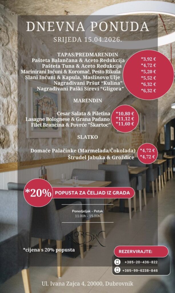 Imate ponudu dnevnih marendi, i želite ih promovirati na dubrovniknetu?! Javite se s povjerenjem na marketing@dubrovniknet.hr ili na 091 344 6000