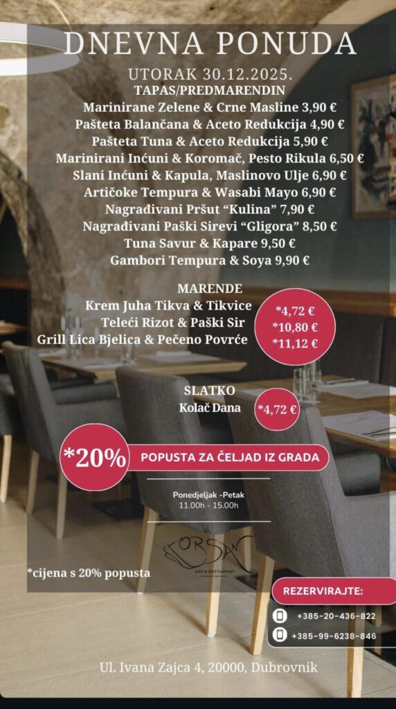 Imate ponudu dnevnih marendi, i želite ih promovirati na dubrovniknetu?! Javite se s povjerenjem na marketing@dubrovniknet.hr ili na 091 344 6000