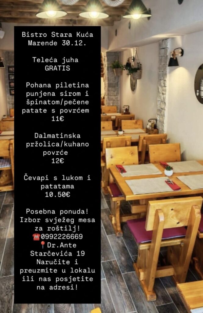 Bistro Stara Kuća, Dr.Ante Starčevića 19, kontakt 099 222 6669, ne vrše dostavu, moguće preuzimanje u restoranu