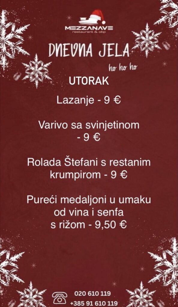 Restoran Mezzanave, Dr. Ante Starčevića 24, telefoni: 020 610 119, 091 610 1119, moguća dostava