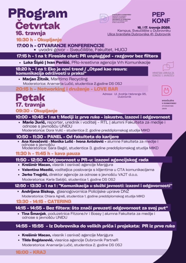 Četvrto izdanje PEP konferencije, u organizaciji studenata i alumnija Fakulteta za medije i odnose s javnošću Sveučilišta u Dubrovniku, u suradnji s Hrvatskom udrugom za odnose s javnošću, počinje u 17 sati na Sveučilišnom kampusu.