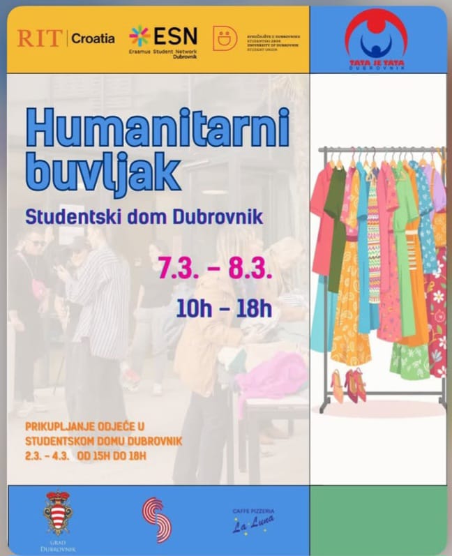 Studentski zbor Sveučilišta u Dubrovniku ponovo organizira Humanitarni buvljak. Prodaja će se održati 7. i 8 ožujka u Studentskom domu od 10 do 18 sati, a stvari i odjeću koje želite donirati možete donijeti 2. i 4. ožujka od 15 do 18 sati. Prekopajte ormare i donirajte što ne nosite!